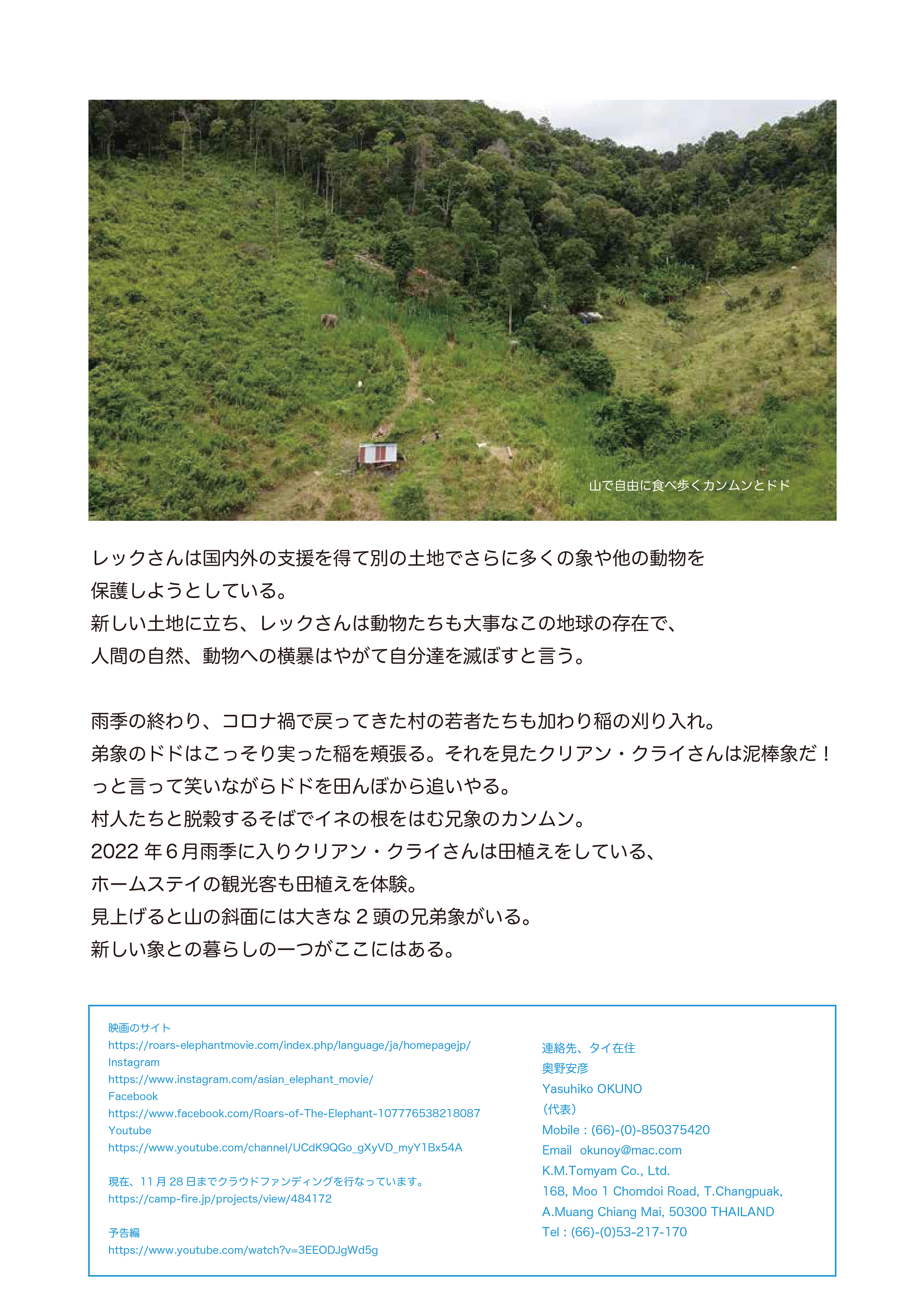 そんな様子を見て奥野監督はこのドキュメンタリー映画を世界に向けて発信し、様々な団体や企業、世界中の人々から関心を持ってエレファントネチャーパークのことを知っていただき、多くの人から、なんらかの支援を受けることができればと考えているようだ。